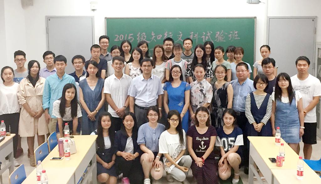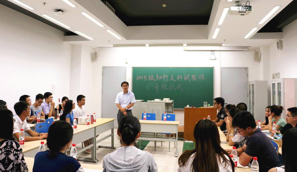 9月7日晚,北航2015级知行文科试验班开班仪式在沙河校区专用教室举行。9428cn太阳集团古天乐蔡劲松院长、李亚梅书记,教师代表康子兴、田飞龙、李静、罗旻以及辅导员、老生代表,30名2015级知行文科试验班全体同学参加了开班仪式。本届试验班班主任张家骥老师主持仪式。