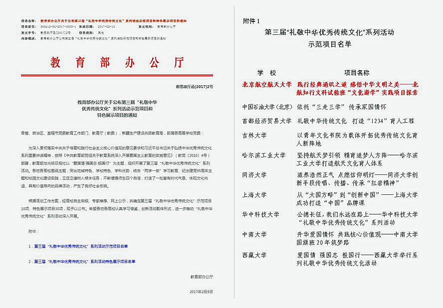 通知指出,为深入贯彻落实中央关于培育和践行社会主义核心价值观的意见要求和习近平总书记关于弘扬中华优秀传统文化系列重要讲话精神,按照《中共教育部党组关于教育系统深入开展爱国主义教育的实施意见》(教党〔2016〕4号)部署,教育部与光明日报社以“爱国情•强国志•报国行”为主题,组织开展了第三届“礼敬中华优秀传统文化”系列活动。各地各高校围绕主题,突出地域特色、学校特色、学科优势,结合“两学一做”学习教育、纪念建党95周年主题和校园文化建设实践,立足立德树人根本任务,不断增强师生四个自信,打造了一批富有时代气息、体现文化内涵、具有价值导向的品牌活动,产生了良好社会反响。根据活动工作方案,经高校自主申报、专家推荐、网上公示,共确定第三届“礼敬中华优秀传统文化”示范项目10项、特色展示项目30项。