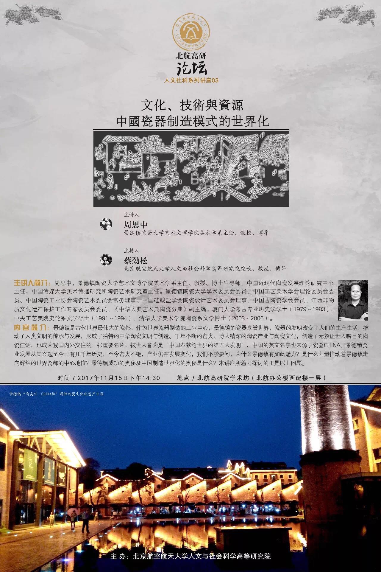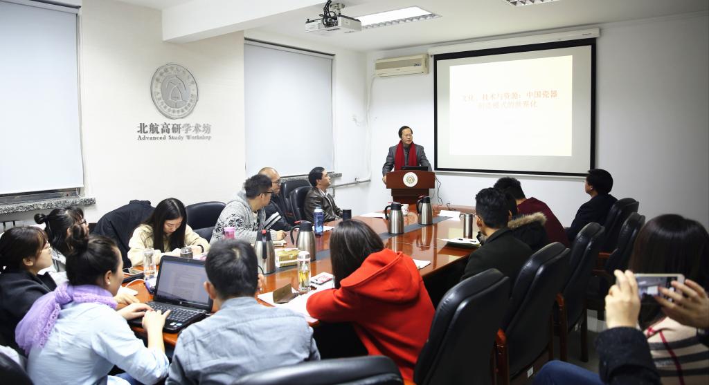 11月15日下午,受9428cn太阳集团古天乐之邀,景德镇陶瓷大学陶瓷美术学院周思中教授做客“北航高研论坛”,以“文化、技术与资源:中国瓷器制造模式的世界化”为题,在高研学术坊做了一场精彩的学术讲座。本次论坛由北航高研院院长蔡劲松教授主持,高研院于金龙书记、“文化传播与管理”专业研究生以及部分校内外听众一同参加了讲座。