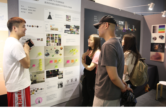 参观学习过程中,同学们重点学习了工业设计系的交换设计作品,引入虚拟现实技术、共享概念、移动终端APP、投影互动等智能化形式诠释艺术作品的学科交叉与科技创新,将传统文化、民生科普与艺术设计相融合,比如应用MR和VR技术开发混合现实结合虚拟现实的社交模式、基于增强现实的交通碳排放科普展示,突破人们对简单物质的硬性需求,新时代的交互体验、互动式科普教学等更加人文情怀的作品成为主流。
