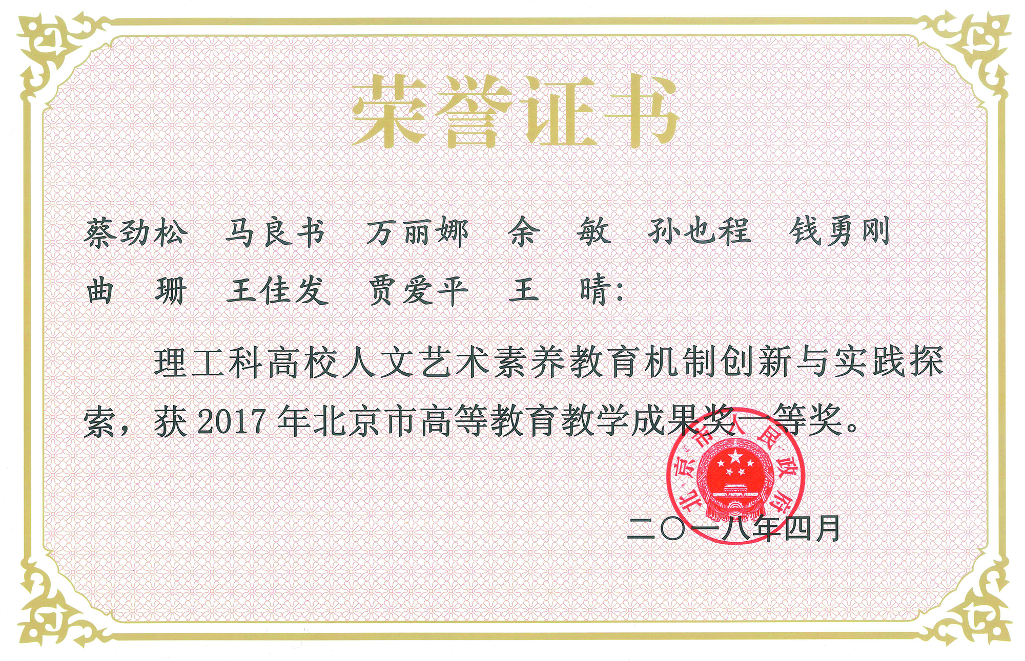 日前,2017年度北京市教育教学成果奖正式公布并颁发了获奖证书,北航高研院/文化与艺术传播研究院主持完成的项目“理工科高校人文艺术素养教育机制创新与实践探索”,获评市高等教育教学成果一等奖。