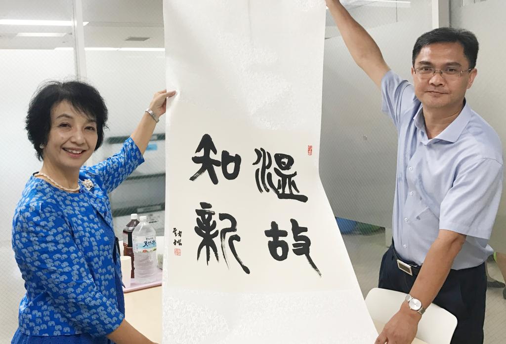 在工学院大学孔子学院,蔡劲松院长与高桥惠子院长就中日文化交流、学生培养和学术互动进行了深入研讨,达成了进一步深化合作的意向。今年时值工学院大学孔子学院建院10周年,蔡劲松院长向工学院大学赠送了书法作品《温故知新》,这也是工学院大学孔子学院的院训,高桥惠子院长愉快地接受了作品。