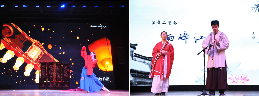 在比赛的间隙,来自法学院的何克兢同学为我们带来了舞蹈《惊鸿一面》;笛萧艺术协会的庄雅迪和景宇哲为我们带来了笛萧二重奏《雨碎江南》,优美舞蹈和悠扬乐曲,搭配诗词大会上选手们妙语连珠的表现,赢得了现场观众们一致好评。
