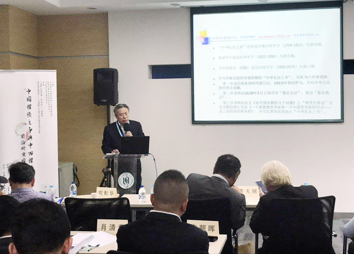 主旨演讲由张教授与比利时根特大学博士研究生暨荷兰莱顿大学博士候选人钱爽联名提交,张教授现场发表。演讲将“华欧比较哲学”分为六期来处理,“中华礼仪之争”属于其中的第四期。又将“中华礼仪之争”析为六步来观察,在第六步上引入章太炎、罗素、爱因斯坦等人之“无神宗教”框架,对“理学无神说”“理学有神说”“理学强有神说”提出批评,认为中华之“理”是有神与无神之合,曰亦有神亦无神,又是有神与无神之离,曰非有神非无神;虽无神,却可收有神之效,合乎“无神宗教”之标准,也合乎1706年8月1日“天含天主与天地万物故比天主与天地万物之主更优”之“康熙格式”。