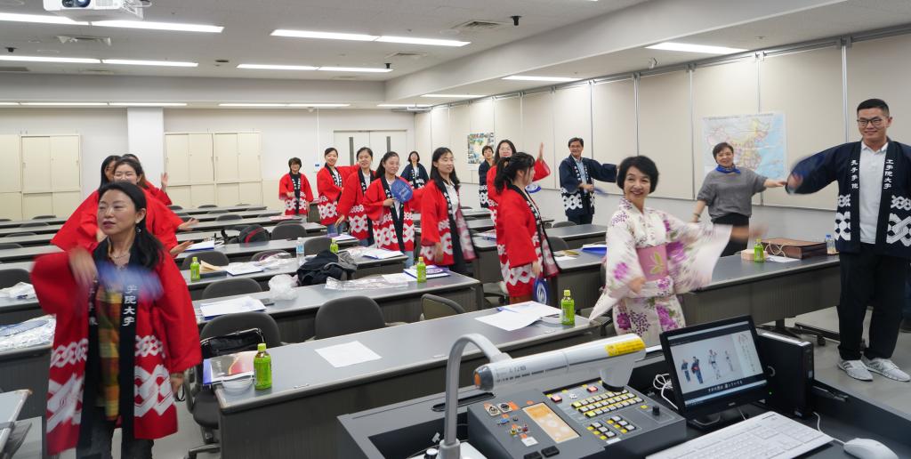 她从便当文化的起源讲起,对日本的饮食文化及其形成原因进行了系统讲解。随后,在日方院长高桥惠子、中方院长赵颖及孔子学院老师的带领下,同学们穿上日本传统和服,现场学习了日本2020年奥运会的主题曲《东京五轮音头2020》,并与孔子学院的老师们一起跳起了搭配主题曲的舞蹈。