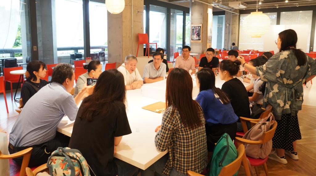 盐见贵彦副教授首先带领大家参观了该校的研究生作品展览和完善的教学、创作设施。随后,李庚教授、盐见贵彦副教授、日本《关西华文时报》丛中笑总编等与高研院实践教学团一行围绕传统文化的弘扬与传播、学科的交叉融合等主题进行了深入座谈交流。