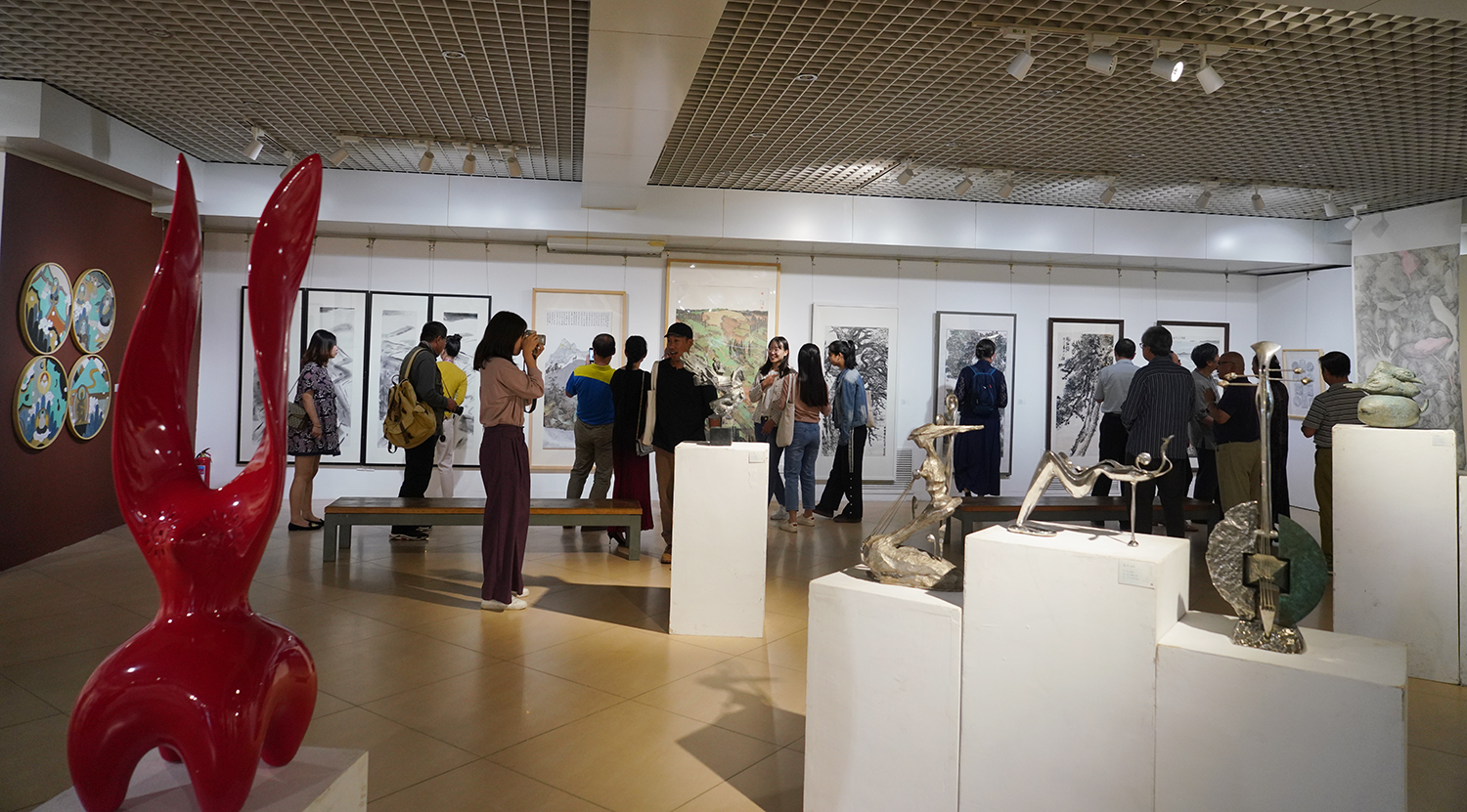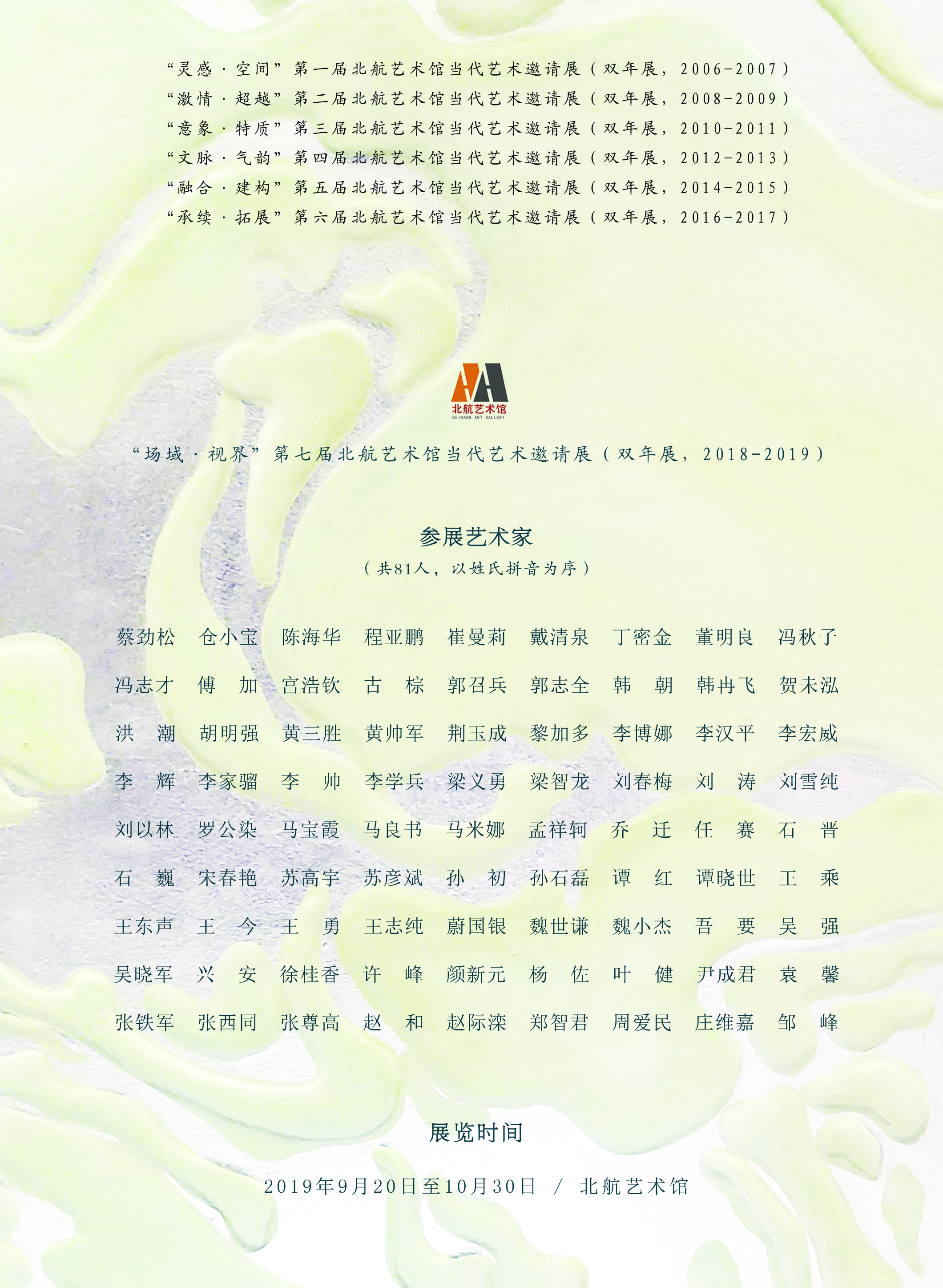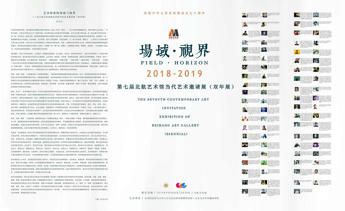 2019年9月19日,“场域·视界”第七届北航艺术馆当代艺术邀请展(双年展)正式拉开帷幕。当天下午,来自全国各地的参展艺术家代表汇聚展览现场,探讨、交流当代学院艺术发展趋向、创作取向及美育价值。展览共邀请了80多位艺术家的作品参展,包括水墨、彩墨、油画、版画、雕塑、装置、综合材料等多个类别,向师生和社会公众呈献了一场具有学术性、独创性,体现当代艺术发展态势的学院艺术盛宴。