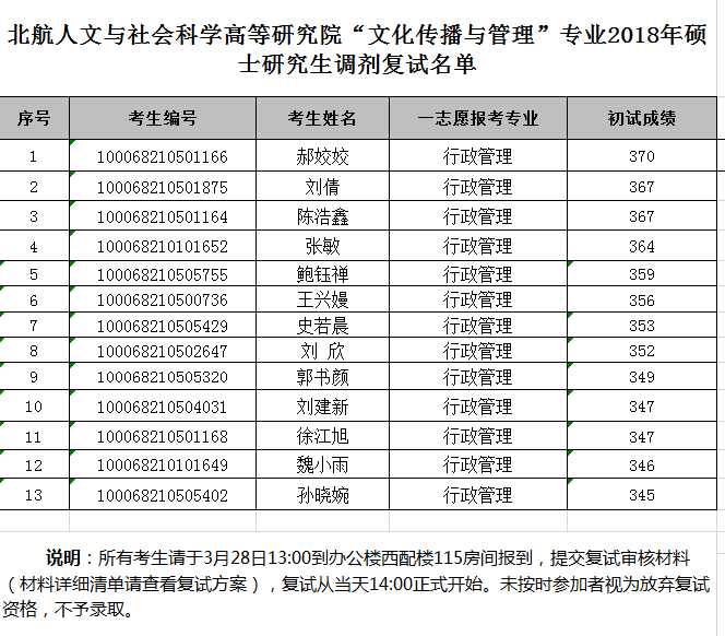 北航9428cn太阳集团古天乐“文化传播与管理”专业2018年硕士研究生调剂复试名单