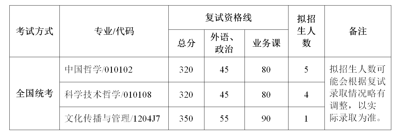 说明:(1)达到复试资格线的考生名单请登录学院网站(http:/)查询;(2)复试采取差额形式,生源充足情况下差额比例一般不低于120%;(3)马克思主义哲学(010101)接收校内考生调剂,调剂工作办法另见学院网站。