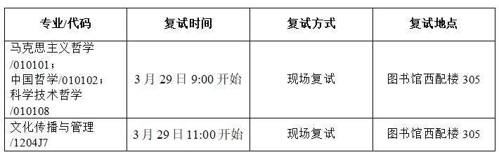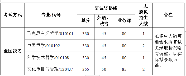 说明:(1)达到复试资格线的考生名单请登录学院网站(http:/)查询;(2)复试采取差额形式,生源充足情况下差额比例一般不低于120%,且不高于150%;(3)我院科学技术哲学(010108)、文化传播与管理(1204J7)专业尚有缺额,在一志愿复试结束后接收调剂,具体调剂要求将于4月初通过学院网站公布,并同时在教育部调剂系统发布,通过教育部调剂系统进行。